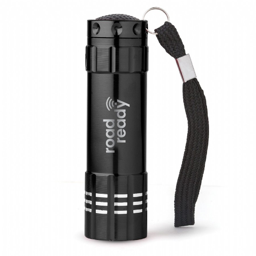 LED FLASHLIGHT WITH NINE BRIGHT WHITE BULBS AND BLACK WRIST STRAP. ALUMINUM CONSTRUCTION WITH LIGHTWEIGHT RICH ENAMEL COLORED FINISH BODY WITH METALLIC SILVER TIP ACCENT. DECORATIVE DIMPLE AND RIBBED ACCENTS, EASY TO USE ON/OFF PUSH BUTTON. 25 LUMEN. REQUIRES 3 AAA BATTERIES